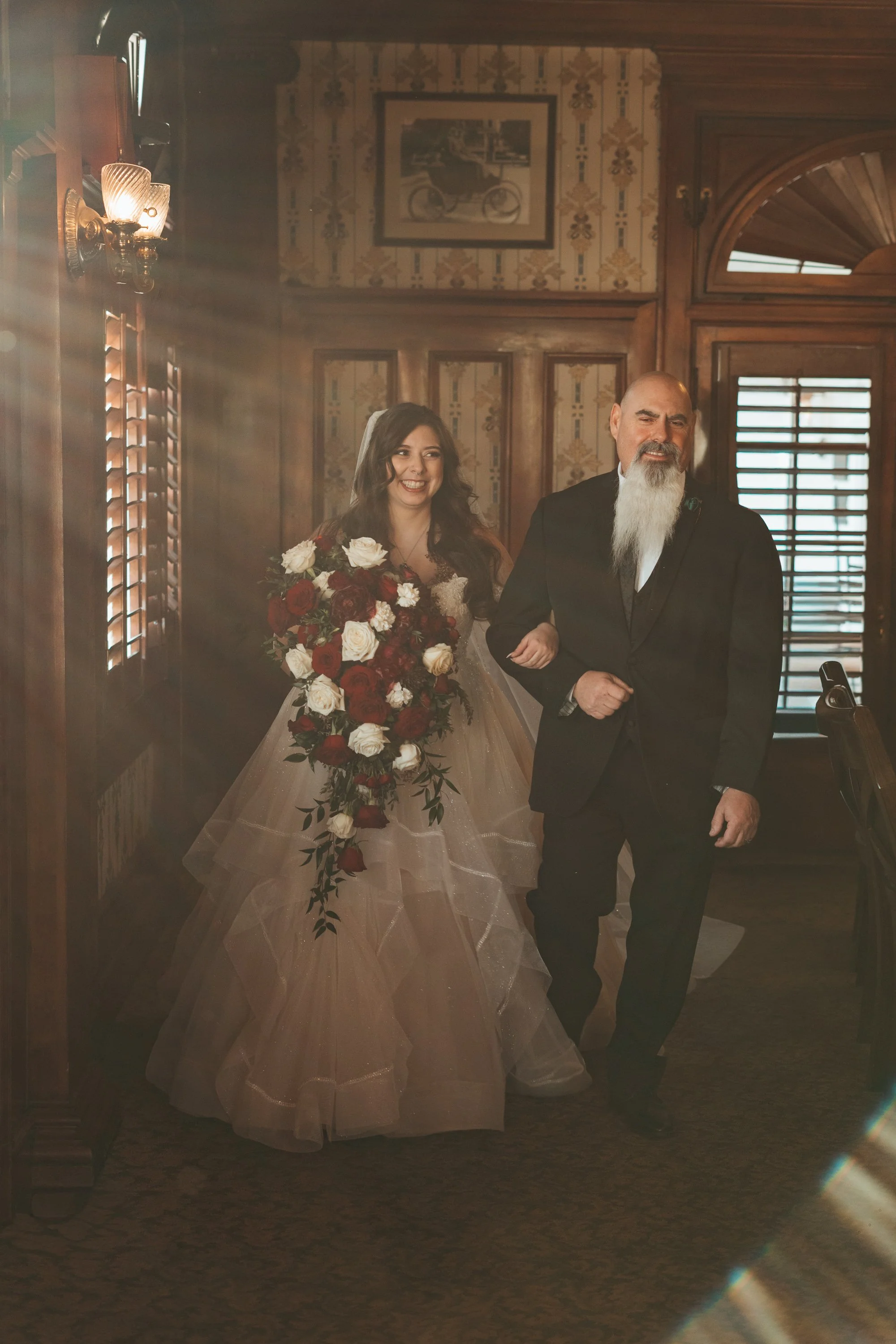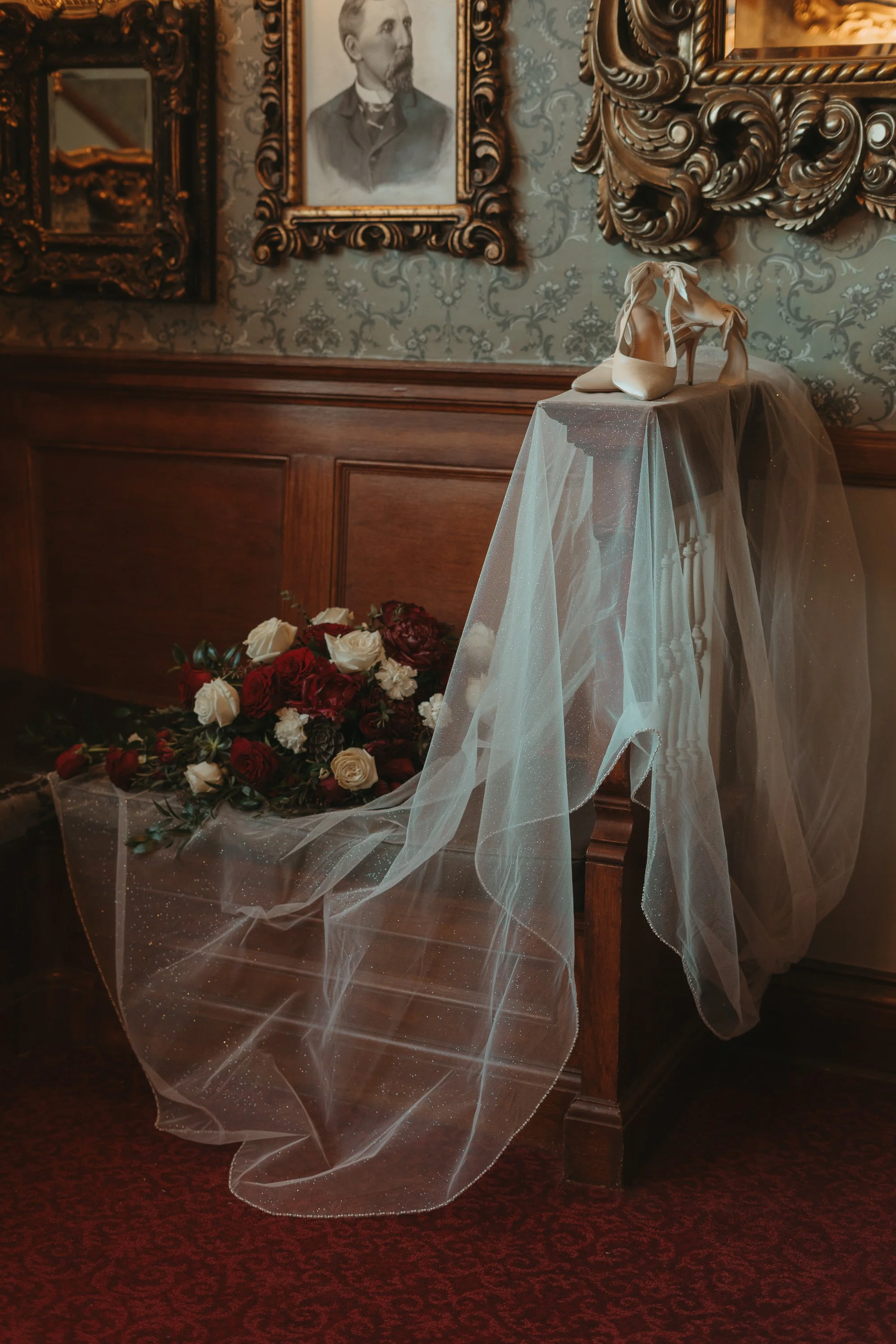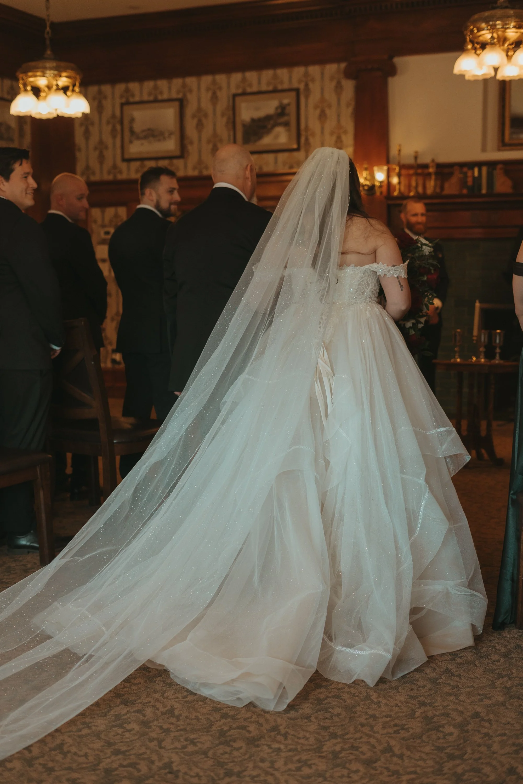 Shaunna + Donovan had the most wonderfully perfect February wedding in one of the most iconic places in Colorado- the Stanley Hotel! They had their ceremony in the library room. There was no shortage of old book smell whimsy, love, and tears of joy on their wedding day. Shaunna had the most beautiful fairytale dress, with a sparkling veil. Donovan’s suit was a beautiful deep emerald green color, perfectly complimenting his orange beard- and everything tied together perfectly for their valentine’s haunting old-timey feeling wedding.